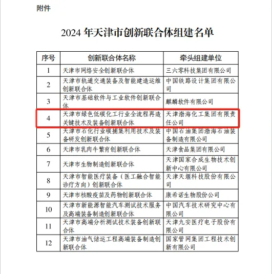 12月19日,天津市科技局發(fā)布《市科技局關(guān)于2024年組建天津市創(chuàng)新聯(lián)合體的通知》,經(jīng)專家評(píng)審、會(huì)議審議和公示等程序,天津渤?;ぜ瘓F(tuán)有限責(zé)任公司(以下簡(jiǎn)稱“渤化集團(tuán)”)牽頭組建的天津市綠色低碳化工行業(yè)全流程再造關(guān)鍵技術(shù)及裝備創(chuàng)新聯(lián)合體正式獲批組建