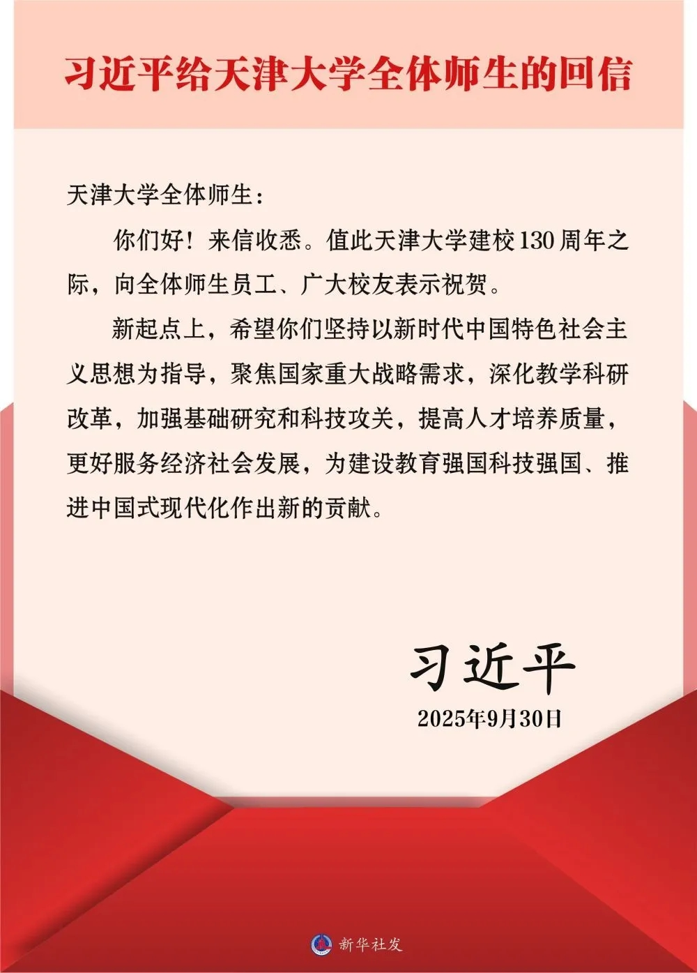 中共中央總書記、國(guó)家主席、中央軍委主席習(xí)近平給天津大學(xué)全體師生回信,在天津大學(xué)建校130周年之際,向全體師生員工、廣大校友表示祝賀。