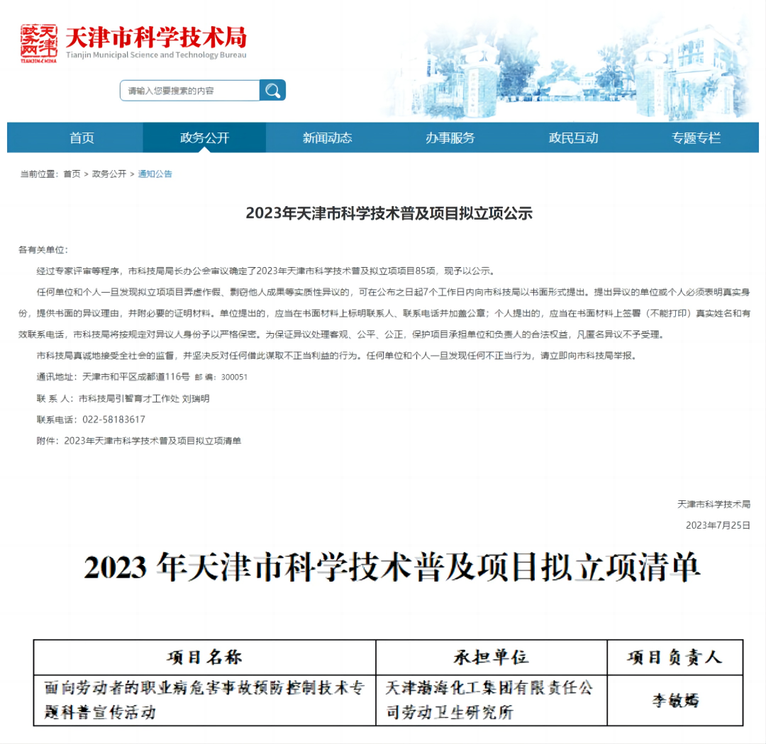近日,2023年天津市科學(xué)技術(shù)普及項目擬立項清單公示,天津渤?;ぜ瘓F有限責(zé)任公司勞動衛(wèi)生研究所申報的“面向勞動者的職業(yè)病危害事故預(yù)防控制技術(shù)專題科普宣傳活動”項目榮登榜單。