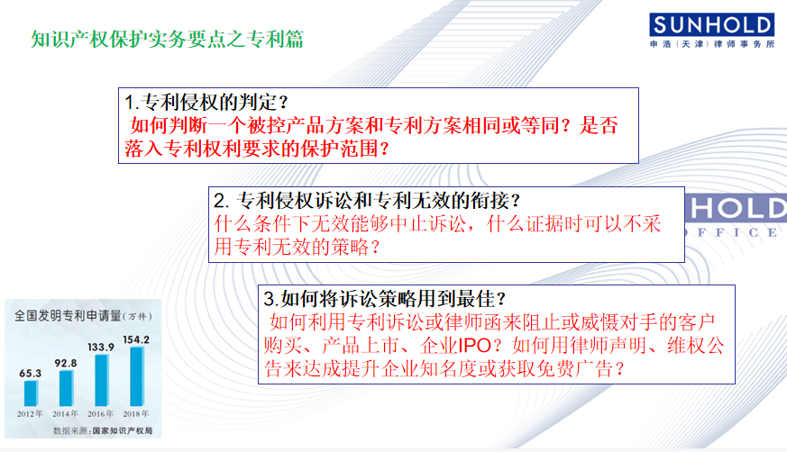 趙宇律師從大量的化工行業(yè)專利侵權及商業(yè)秘密侵權典型案例切入,詳細介紹技術型企業(yè)知識產權風險要點。從專利侵權判定、專利訴訟和無效的銜接、訴訟策略、程序及證據問題等方面講解專利保護途徑和策略;從技術型企業(yè)防止骨干另起爐灶、破解商業(yè)秘密民事訴訟中秘密性和同一性難題、刑事立案時證據收集等方面揭示商業(yè)秘密保護的難點與要點。對技術型企業(yè)如何提前規(guī)避專利侵權風險以及保護商業(yè)秘密給出定期盤點涉密信息、外宣活動注意保密、做好涉密員工管理、完善外部參觀訪問制度、確定商業(yè)秘密保護合同、構建完善的保護制度等合規(guī)建議。