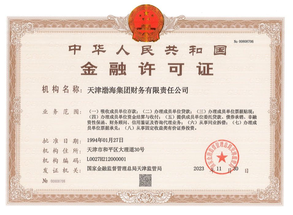 根據(jù)《企業(yè)集團(tuán)財(cái)務(wù)公司管理辦法》的規(guī)定,天津渤海集團(tuán)財(cái)務(wù)有限責(zé)任公司業(yè)務(wù)范圍發(fā)生變更,經(jīng)國(guó)家金融監(jiān)督管理總局天津監(jiān)管局批準(zhǔn),同意換領(lǐng)《中華人民共和國(guó)金融許可證》,現(xiàn)予以公告。