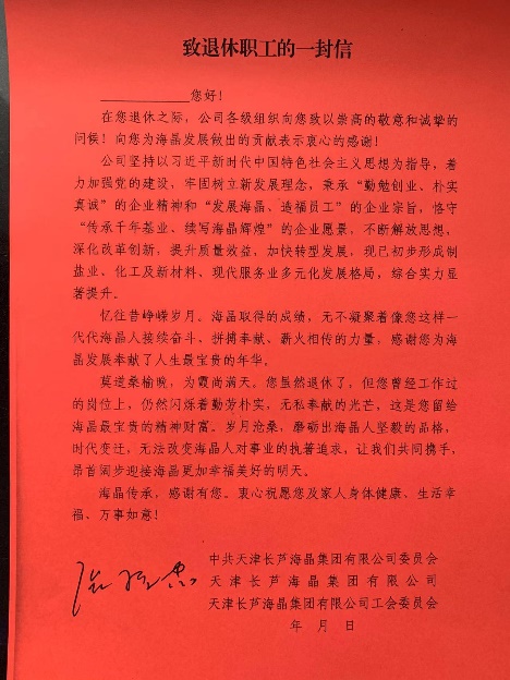 按照集團(tuán)公司工會(huì)《關(guān)于開展職工退休前“四個(gè)一”暖人心工作的通知》(津渤化工發(fā)〔2021〕30號(hào))文件要求,海晶公司工會(huì)用小載體體現(xiàn)大情懷、真感情,用心用情做好職工退休前“四個(gè)一”暖人心服務(wù)工作,通過“舉辦一個(gè)小儀式”“遞上一封感謝信”“贈(zèng)送一份紀(jì)念品”“送上一張服務(wù)卡”活動(dòng),突出退休儀式感,提升職工幸福感。